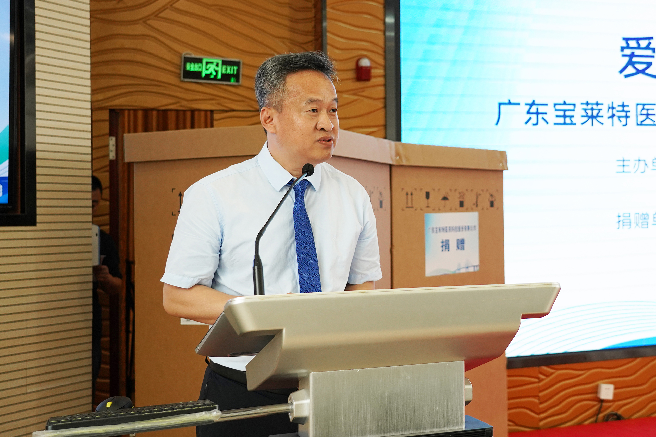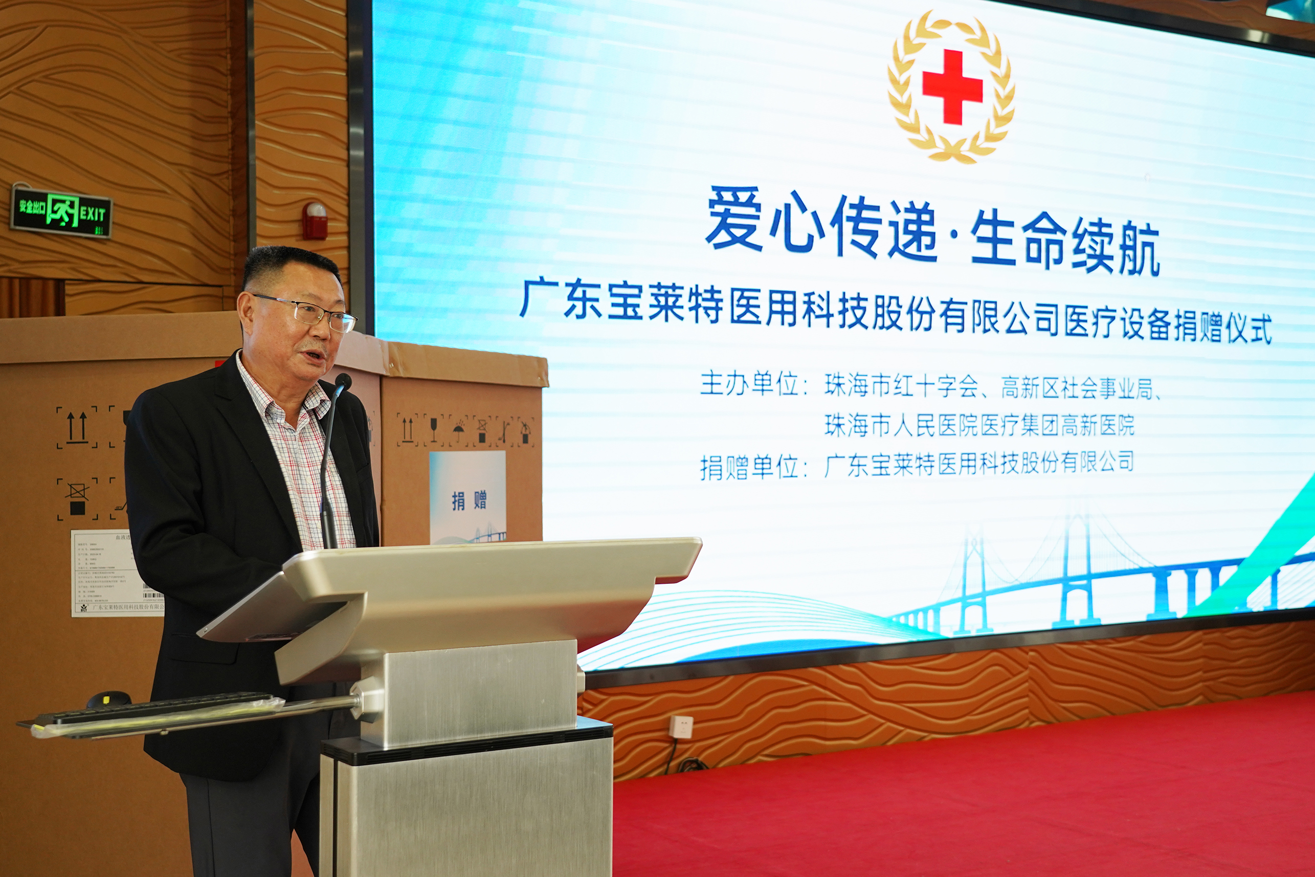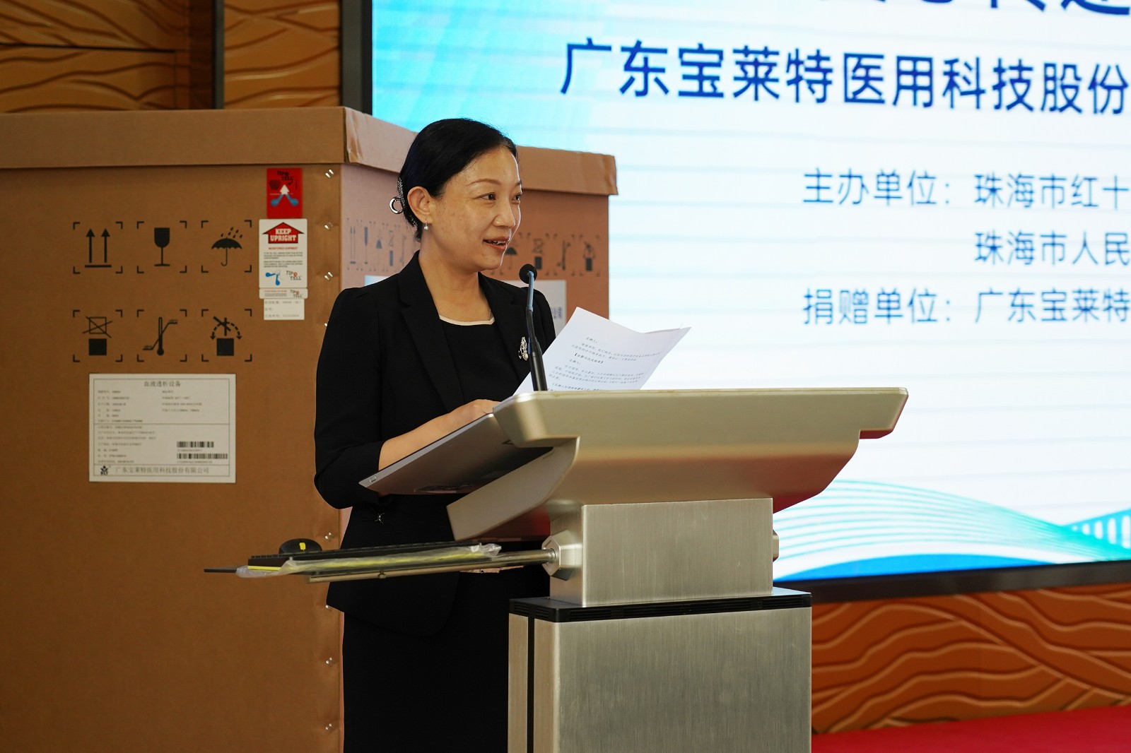 珠海市红十字会党组书记、常务副会长陈志英发表讲话,表示:此次宝莱特捐赠的一批设备,不仅直接提升了高新区人民医院的诊疗条件,减少肾病患者往返医院的时间;更是以实际行动诠释了“仁道、博爱、奉献”的红十字精神,为医疗公益事业注入了温暖和坚定的力量。近年来宝莱特通过红十字会捐赠物资及款项合计216万元,有力支持了我市医疗及教育,乡村振兴帮扶,科技发展等工作。未来希望与宝莱特一起谱写“健康中国”“健康珠海”的美好篇章。